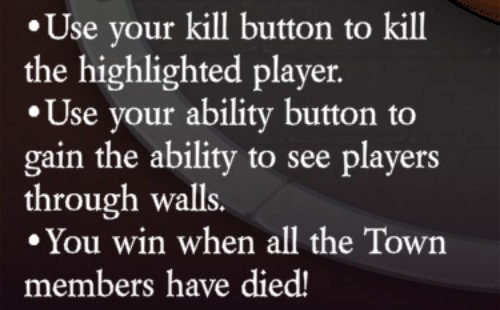 Uses their kill button to kill the highlighted player (unlimited uses). Uses their ability button to gain the ability to see players through walls (unlimited uses, 10 second duration, 45 second cooldown).
