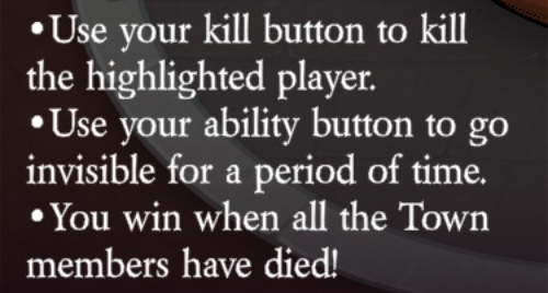 Uses their kill button to kill the highlighted player (unlimited uses). Uses their ability button to go invisible for a period of time (after they kill).