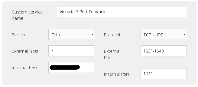 Now, first, type into the Custom service name “Victoria 2”. This doesn’t change anything but makes it easier to find later on. Now, the Service option won’t matter so go to the Protocol option, there select the option that says TCP – UDP or the option that includes both of those. Next go to External host and Internal host. For External Host, if you only want to host to one person or one computer then you would put their IP there but why would you do that when you can just kick them. Anyways, go down to Internal Host and put your IPv4 Address. Then go to External Port and Internal Port. In the External Port place you want to put “1631-1640” just like that. In the Internal Port option you want to put “1631”.