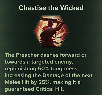 With the Preacher you are going to be in close combat a lot. You also need to remember that Toughness is an Infinite resource whereas Health is a Finite resource. You have to find ways to replenish health. Your Toughness will regenerate on its own so why not keep it topped off so you do not start to lose your health. This gives you toughness without having to be aggressive as well, you can Block and Push enemies and still be gaining toughness; You do not need to be attacking.
